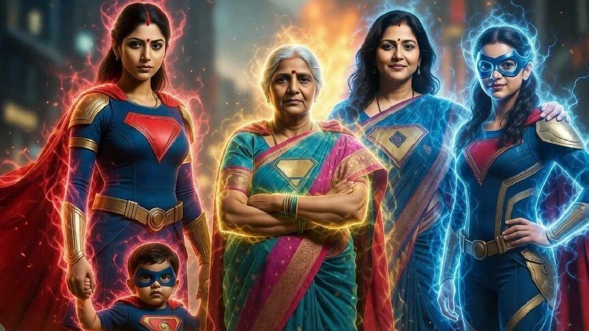 A joyful depiction of three generations from a South Asian family can also be created. The grandmother in a silk saree, her daughter in a fusion salwar-suit, and a granddaughter in playful denim embody the richness of cultural heritage. Surrounded by traditional decorations, this portrait highlights the joy of family bonds.